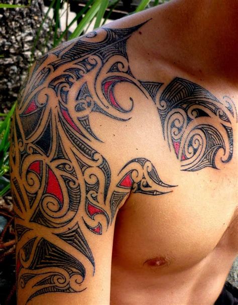 Art work tattoo source 27. The solid reds and solid blacks in this piece give it a bold and confronting attitude. This is made up of mostly solid sections with well used minimal negative space. This tattoo design is classified by its highly intricate lines and imagery that is present in every tattoo. Beautiful maori tribal tattoo on right half.