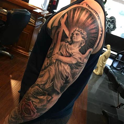 What do angel tattoos symbolize? Having a tattoo of the mystical super beings on the nape of your neck, backside or better still on your chest, speaks volumes about your god and faith. Angel based designs in memory of a loved one are therefore a common choice. Angel tattoos represent our love of god. Angel tattoo on arm 16.