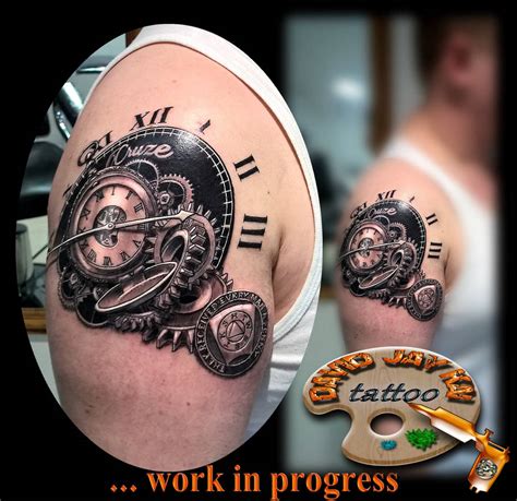 Grey and black clock gears tattoo on front shoulder. Designing a clock tattoo requires extra care to escape from an infection or allergic reactions. I really don?t think the collectors want us to leave very much. Closer to the wrist, there is a tattoo of what seems to be a speedometer.